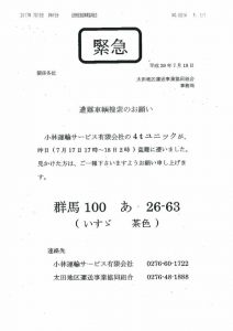 群馬県 いすゞ4tユニック車 茶色 盗難